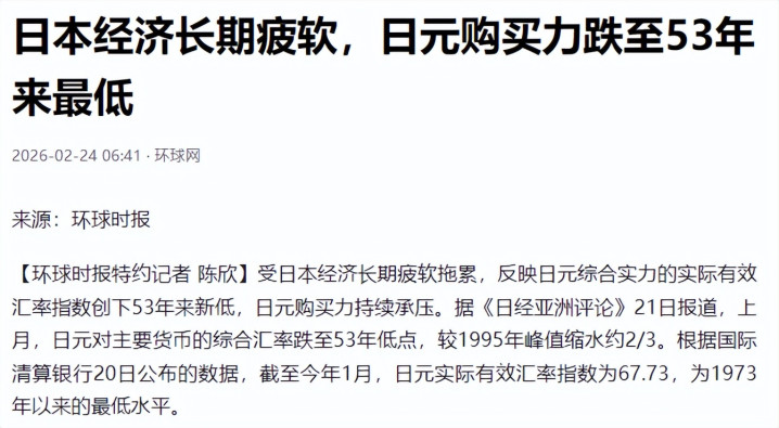 中国的制裁来得正是时候,而此时的日本,早已深陷经济泥潭,难以自拔。国际清算银行最新数据显示,今年1月,日元实际有效汇率指数降至67.73,创下了1973年日本实行浮动汇率制度以来的53年最低水平,较1995年的峰值缩水约2/3,日元作为主要货币的地位已经摇摇欲坠。